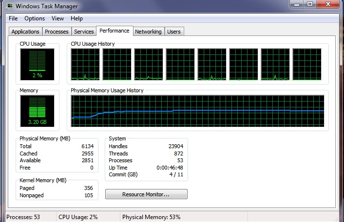i have attatched a screen shot of my task manager with bf3 running the first 4 boxes are the physical core and the last for are virtual cors the cpu% drops to like 2% when i minimize the game but while in game its like 15% and primary stays with in the 2 physical and 2 virtual cores